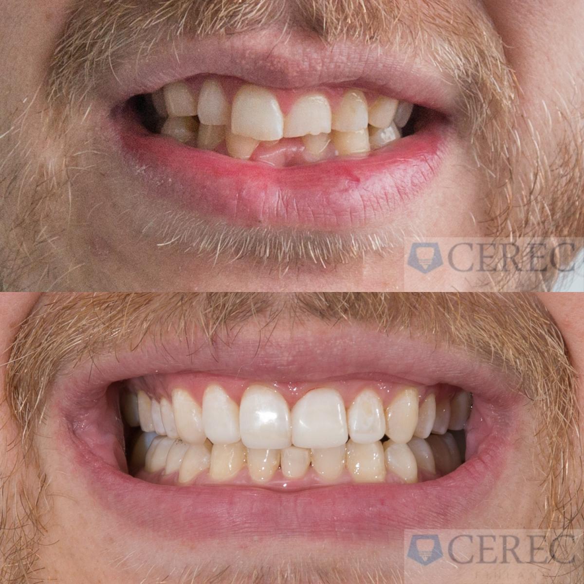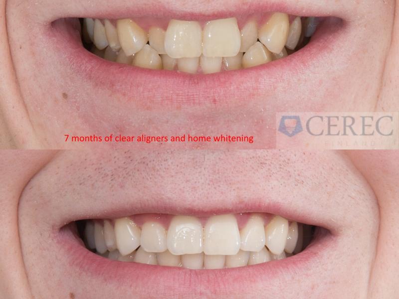 Voimakkaan ahtauden eliminoiminen yhden hampaan poistolla, 6kk kalvo-oikomisella sekä kuluneiden kohtien paikkaus muovilla.