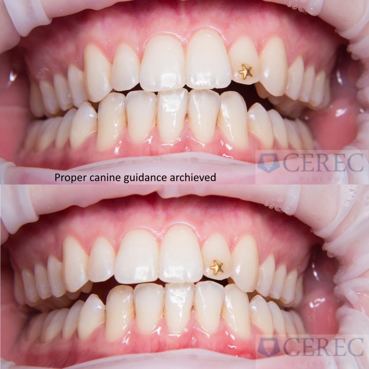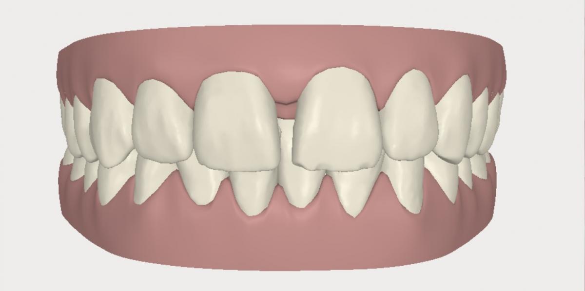 Potilasta häiritsi yläetualue ja piilossa olevat kulhampaaat. Tämä loi tilanteen jossa vain neljä etuhammasta näkyi luoden lapsimaisen vaikutelman. Tilanne korjattiin kalvo-oikomisella alle 6kk aikana ja retentoitiin Memotain ultra-ohuilla retentiolangoilla.