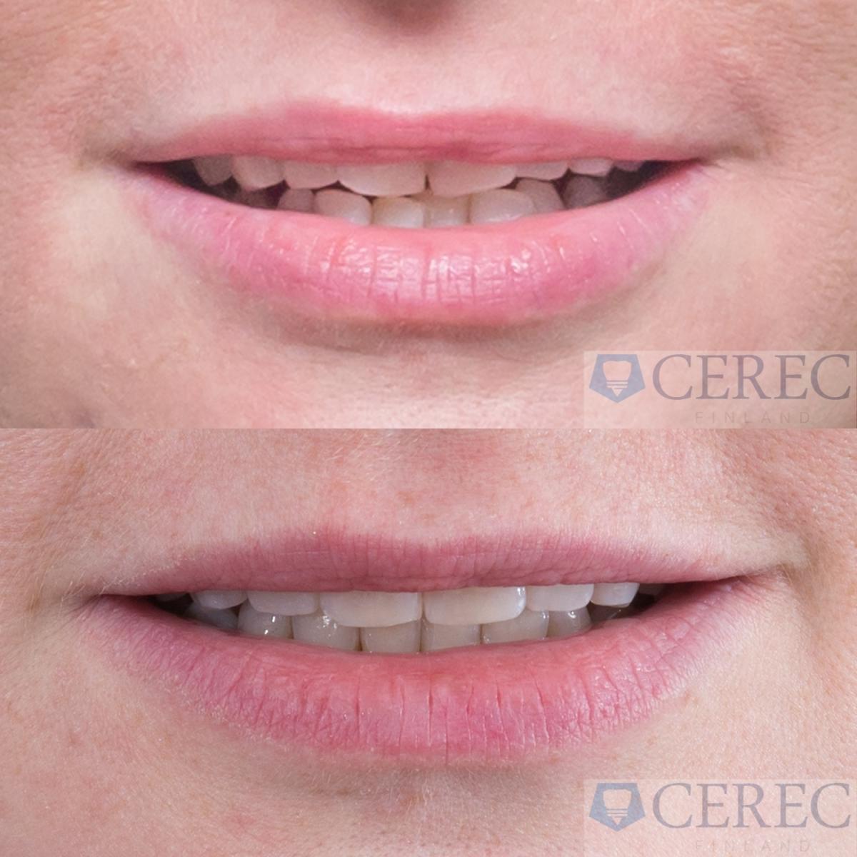 Kiertyneiden ja ristipurennassa olevien hampaiden oikominen 9kk aikana. Hoitojaksoon kuului 10 käyntikertaa mukaanlukien alkukonsultaatio. Voimakkaasti kiertyneet hampaat saatiin käännettyä riviin, hampaat valkaistiin ja lopuksi tehtiin kiinteä retetio ylä- ja alaleukaan